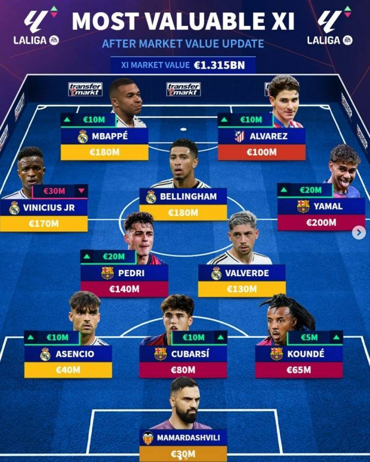 直播吧6月9日讯 德转更新了西甲球员身价,并盘点了目前西甲最贵阵容,其中亚马尔、姆巴佩、贝林厄姆在列,具体如下: